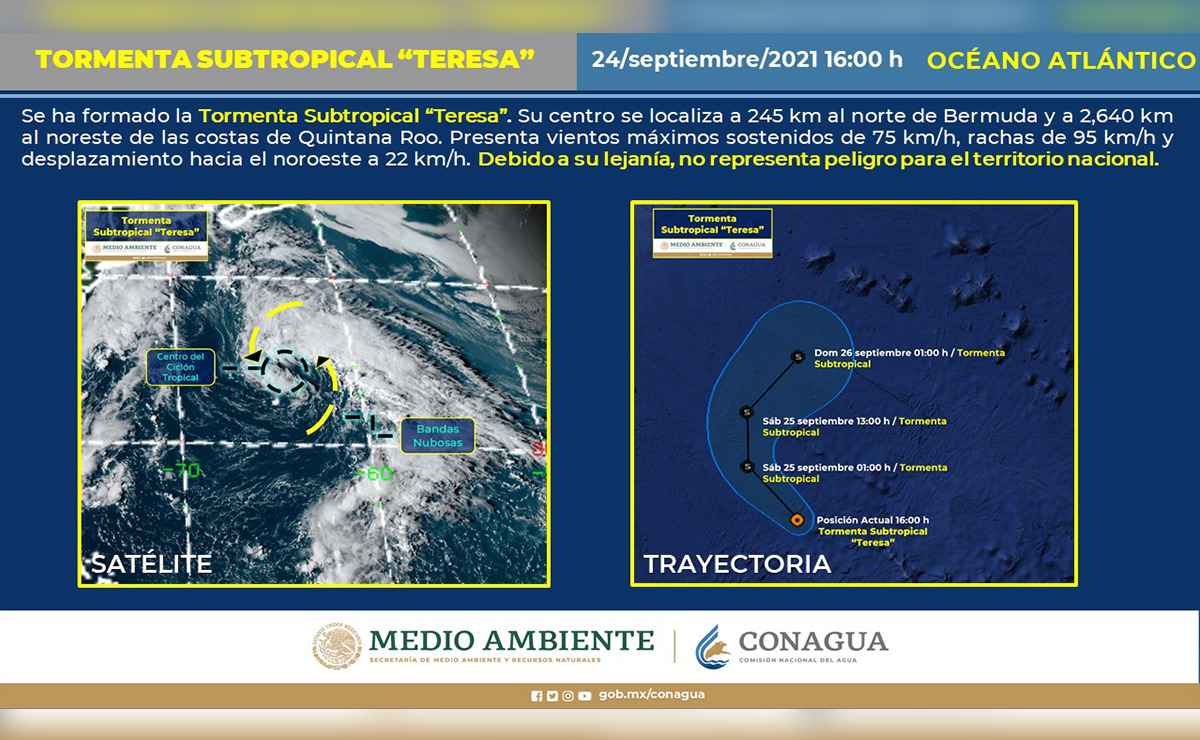 Se formó la #Tormenta Subtropical #Teresa en el océano #Atlántico. Su centro se localiza a 245 km al norte de #Bermuda, y a 2,640 km al noreste de las costas de #QuintanaRoo. Debido a su lejanía, no representa riesgo para el país. Más detalles en 👉https://t.co/iGFK4kaRaU pic.twitter.com/ZW21mvG4dp