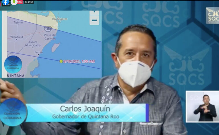 A través de su participación en el programa Conexión Ciudadana, el mandatario estatal ofreció una actualización de la evolución del meteoro, indicando que la zona donde habrá mayor afectación, será en la zona sur del municipio de Tulum.