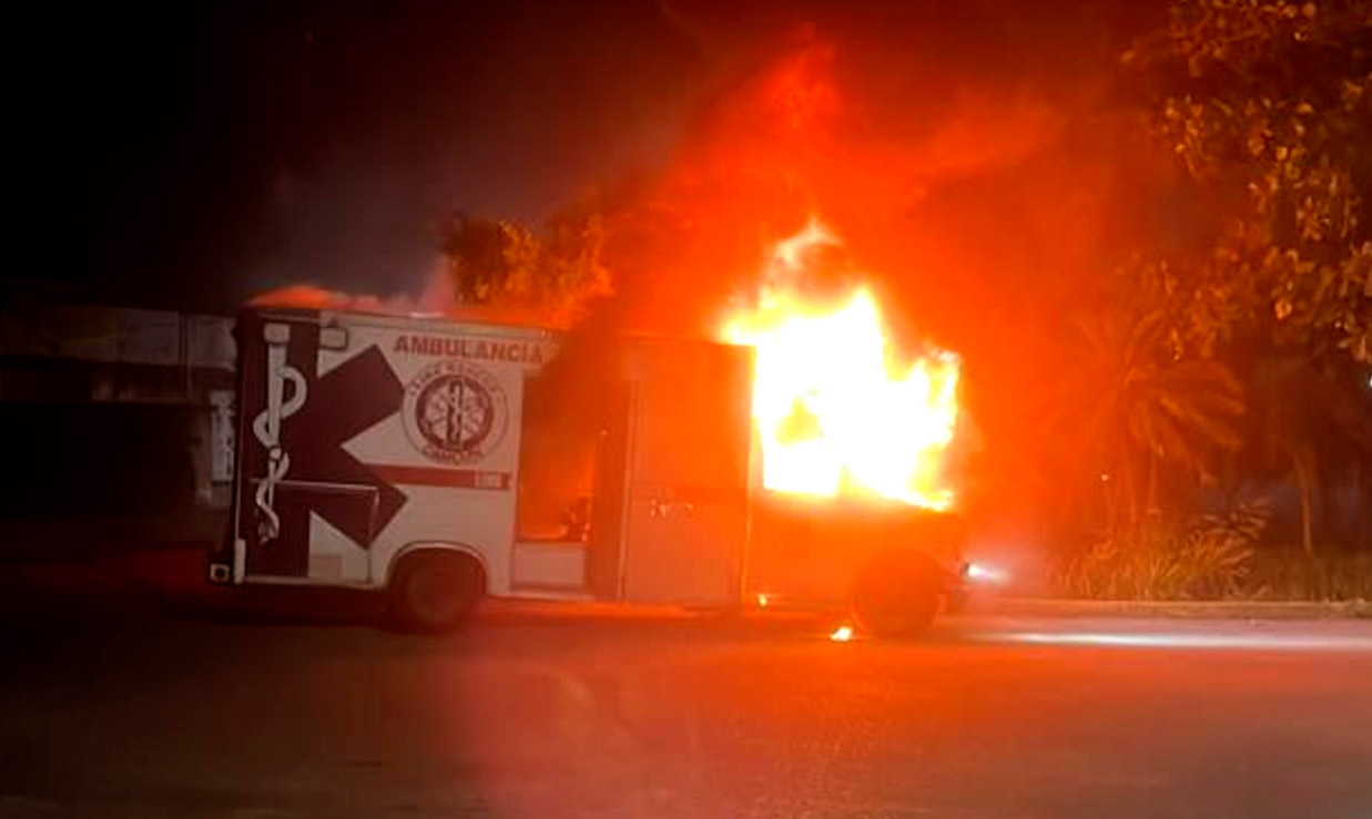 Una ambulancia de una empresa privada fue consumida por las llamas en una céntrica avenida de Cancún. Hasta el momento se desconocen las causas que originaron el incendio que acabó con la unidad de rescate médico.
