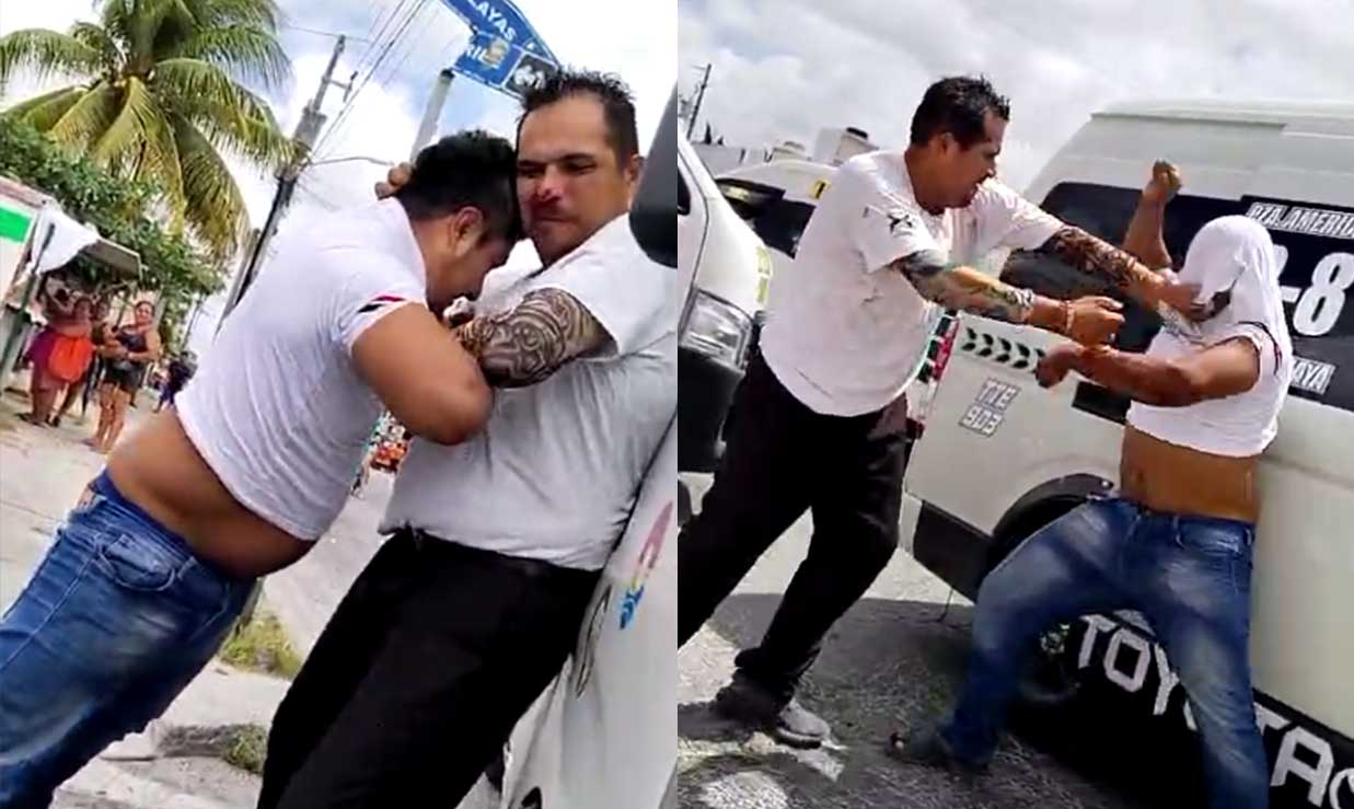 Dos sujetos, presuntamente choferes de unidades de transporte público, fueron captados en un video peleando a golpes en plena vía pública de una colonia en Cancún. A pesar de las advertencias de algunos transeúntes para que se calmaran, la riña continuó durante varios minutos.