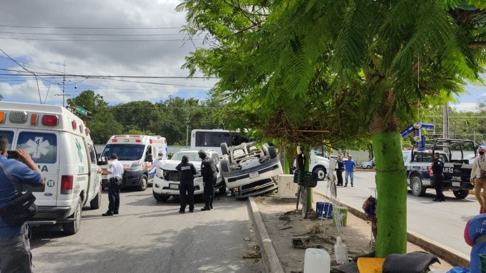 Una aparatosa volcadura con saldo de cuatro personas lesionadas se registró esta tarde en la avenida López Portillo y la Avenida 149, en frente de la Guarnición Militar de Cancún, en la Supermzana 103.