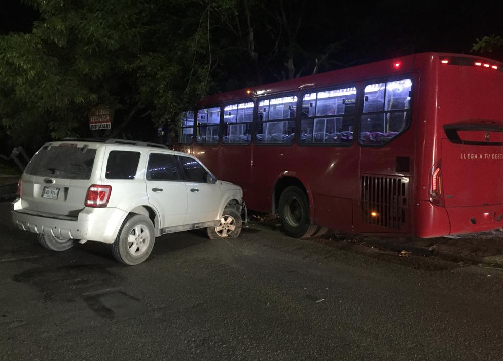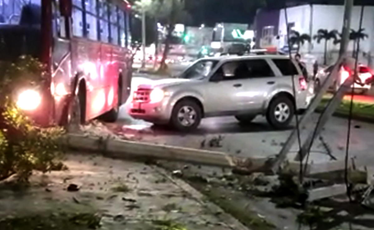 Un conductor presuntamente en estado de ebriedad ocasionó un violento choque contra un autobús de la empresa autocar cargado de pasajeros en la Super manzana (SM) 92 de Cancun, del impacto, la unidad de transporte colisionó contra un poste derribándolo y causando un fuerte corto circuito que dejó sin energía eléctrica a varias calles.
