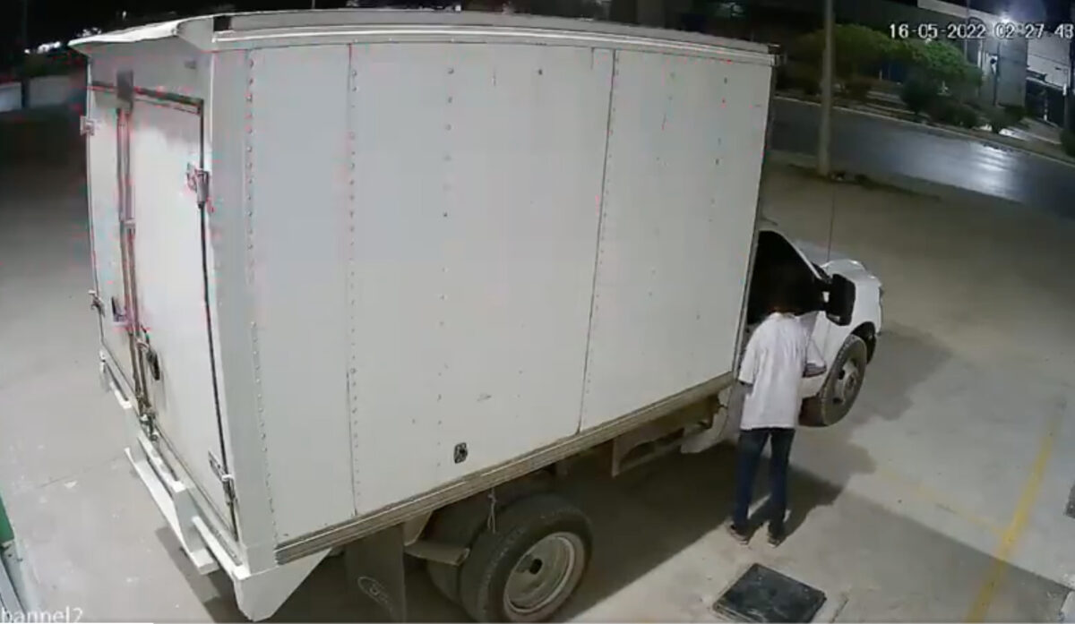 Las imágenes del documento gráfico muestran como el sujeto entra con total tranquilidad al lugar y empieza a forzar la portezuela de la camioneta de carga, marca Ford modelo F-350 de color blanco y placas VM6307B, con caja cerrada.