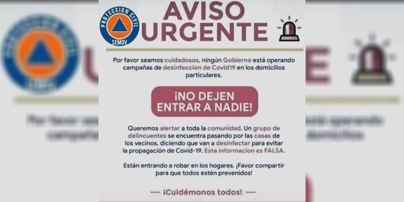 En el aviso se advierte de que «ningún Gobierno está operando campañas de desinfección del referido virus en los domicilios particulares» y pide difusión «para que todos estén prevenidos».