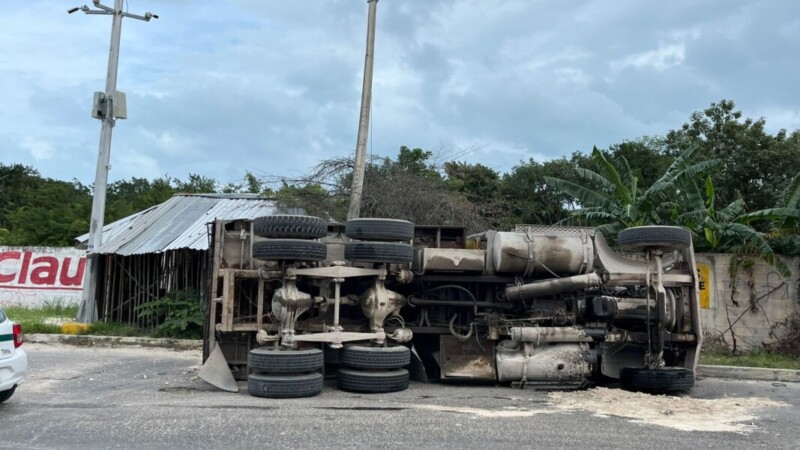 Cancún.- Tremendo susto para transeúntes y automovilistas al percatarse de que un camión de carga se quedó sin frenos provocando la volcadura de la pesada unidad.