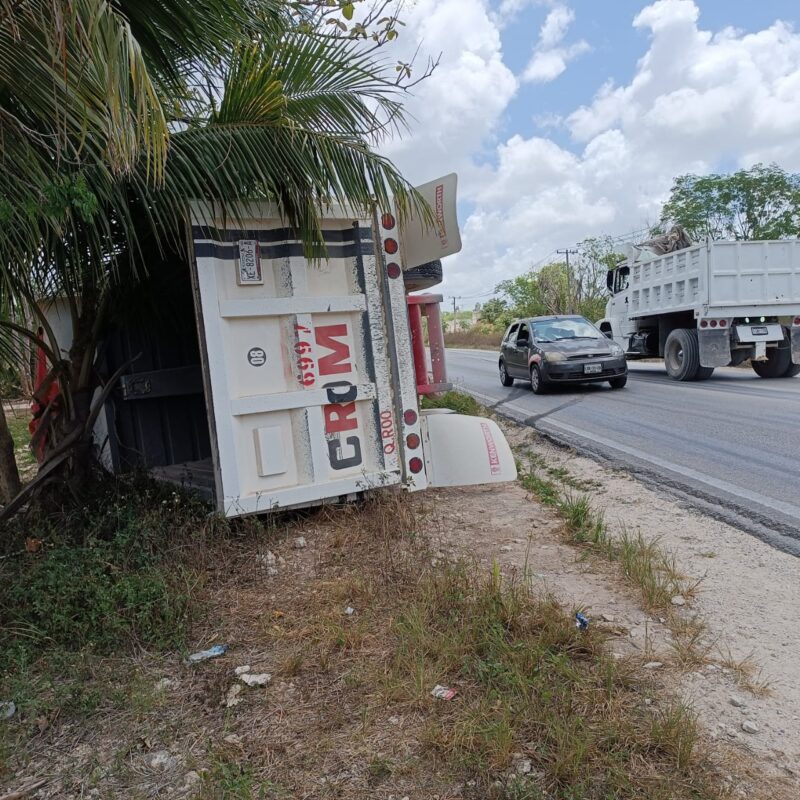 Volquetero termina volcado en la carretera Cancún-Leona Vicario