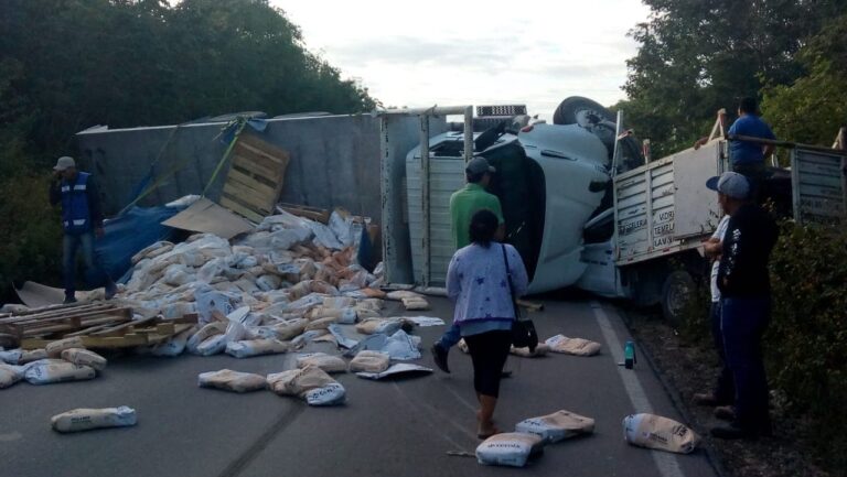 Cancún. Q. Roo.-Un camión que transportaba bultos de cemento, quedó volcado sobre la carretera conocida como Gas Auto, poco antes de llegar al libramiento de la autopista Cancún-Mérida, donde aplastó una camioneta tipo Nissan.