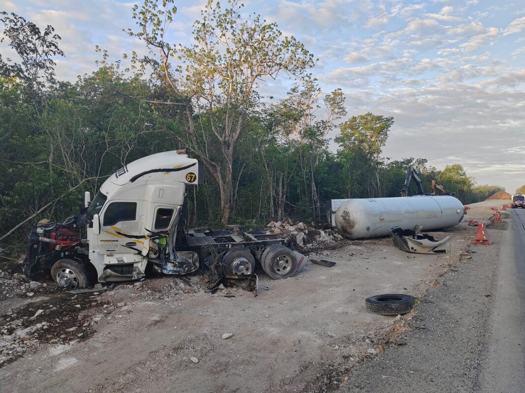 Vuelca pipa cargada con gas LP en la carretera Mérida-Cancún