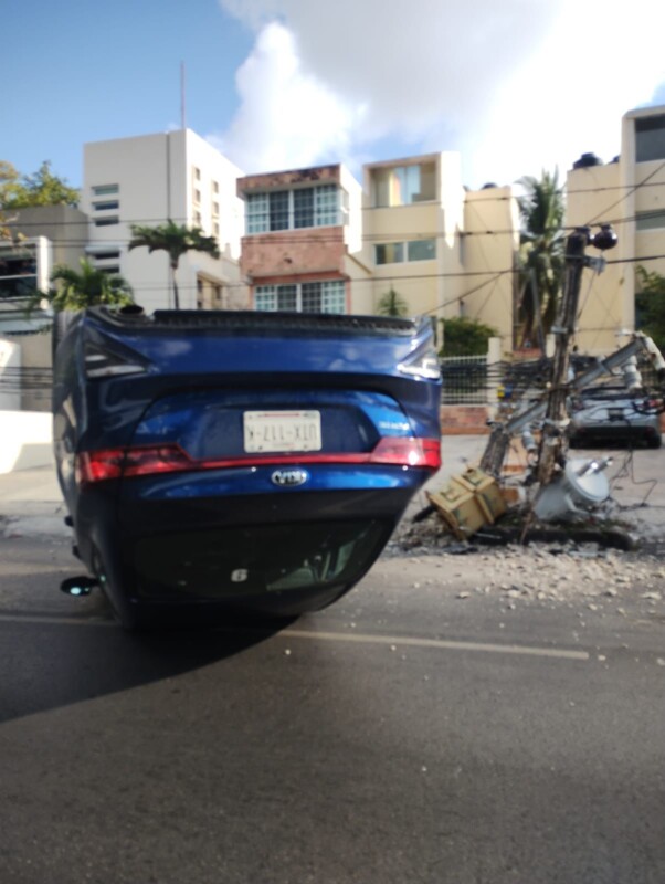 El conductor del vehículo marca Kia, modelo Forte de color azul metálico, resultó lesionado tras protagonizar el fuerte encontronazo en contra del sostén del cableado eléctrico la mañana de este martes en la supermanzana 32 de Cancún, en donde el automóvil terminó volcado tras el impacto.