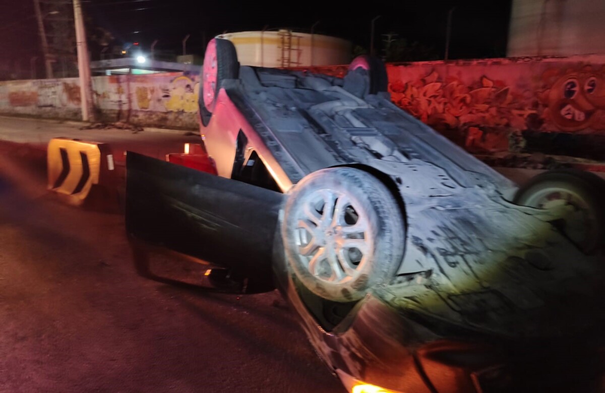 Un automóvil volcó la madrugada de este lunes en el cruce de las avenidas Kabah y Huayacán, en Cancún, sin que se reportaran personas lesionadas.