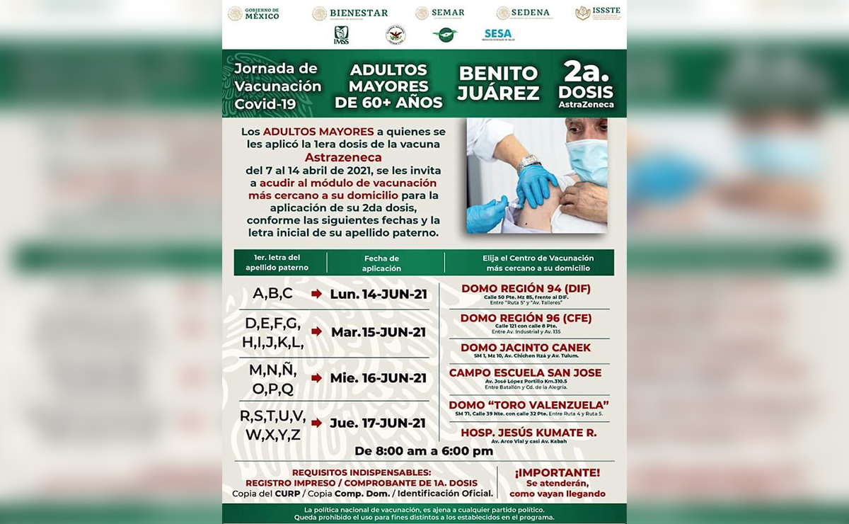 Para el lunes 14 de junio, será para quienes sus apellidos inicien con la A, B, o C, mientras que el martes 15, para los de la D, E, F, G, H, I, J, K, y L, el miércoles 16, para los de la M, N, Ñ, O, P, y Q, finalmente el jueves 17, se ha convocado a las letras R, S, T, U, V, W, X, Y, y Z, todos en horario de 8 de la mañana a 6 de la tarde, en el punto de vacunación más cercano a su domicilio, siendo estos el domo de la región 94, 96, Jacinto Canek, Toro Valenzuela, Escuela San José y Hospital General.