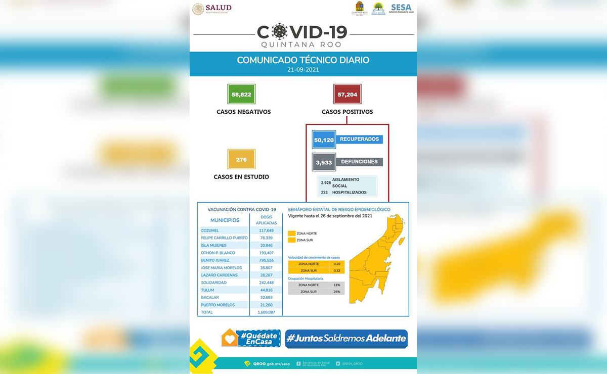 Este martes 21 de septiembre, se agregaron a la cuenta de contagios de covid-19 en Quintana Roo 109 nuevos casos, con lo cual ya son 57 mil 204 contagiados por el virus según detalla la secretaria de Salud (Sesa) en el estado.