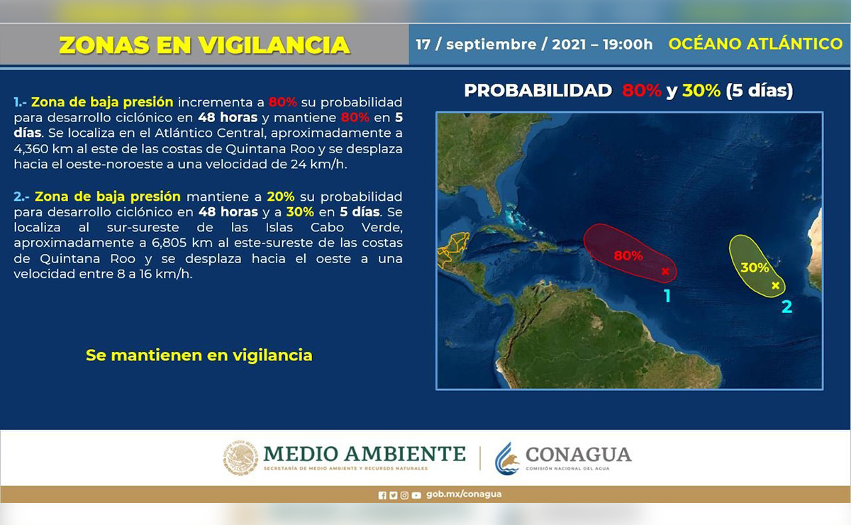 Una zona de baja presión en el Oceáno Atlantico aumentó a un ochenta por ciento sus probabilidades de convertirse en desarrollo ciclónico en las siguientes 48 horas, según informó hace unos momentos la Comisión Nacional del Agua (Conagua).