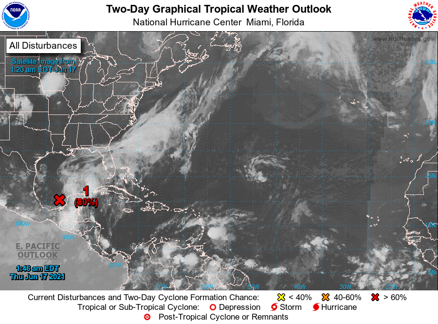 Zona de baja presión con 80% de probabilidad de desarrollarse a #CiclónTropical en 48 h. Se ubica a 175 km al nor-noreste de Coatzacoalcos, Veracruz. Generará lluvias torrenciales en Quintana Roo. pic.twitter.com/XJbqIqW7OU