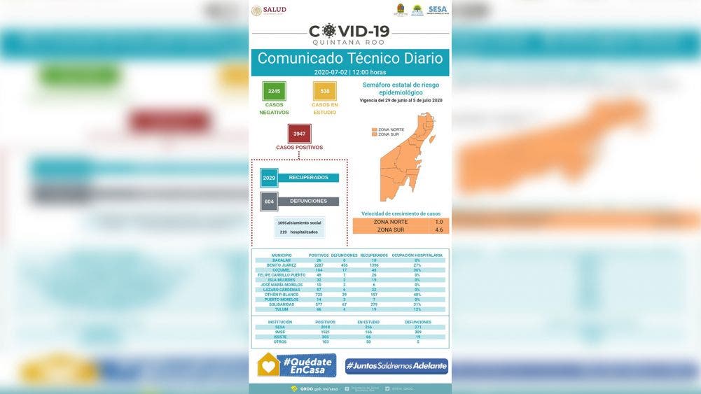 72 casos nuevos de Covid 19 en 24 horas en Othón P. Blanco.- De continuar el aumento en el contagio de coronavirus, mañana se llegará al 50 por ciento de ocupación hospitalaria, en 24 horas hay 72 nuevos casos en Othón P Blanco.