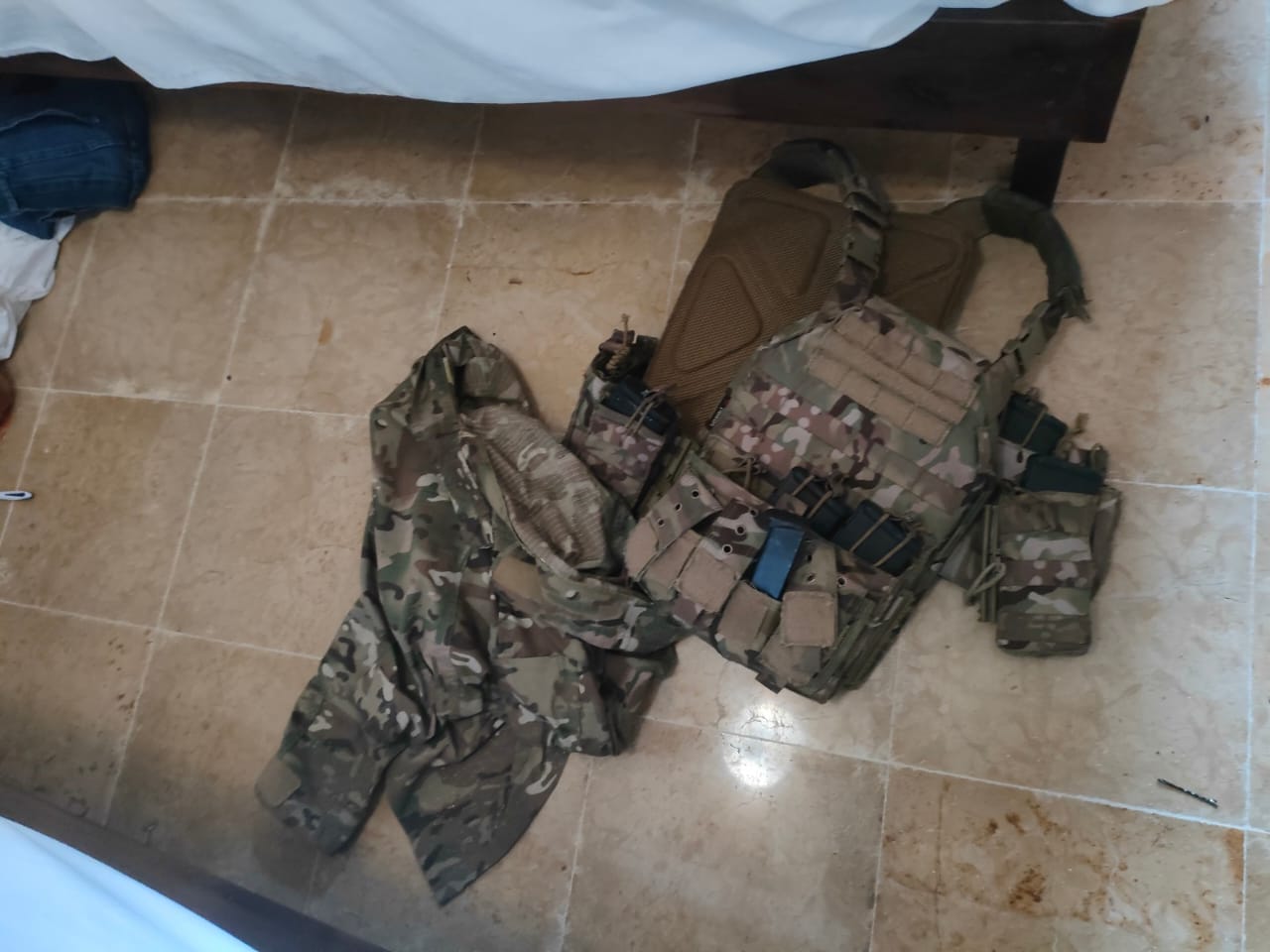 4 Armas largas, 3 armas cortas, 32 cargadores para arma larga, un cargador de disco para arma larga, 6 cargadores para pistola, una granada de mano, tres chalecos antibalas, un uniforme camuflajeado, dos vehículos y cientos de cartuchos de grueso calibre.