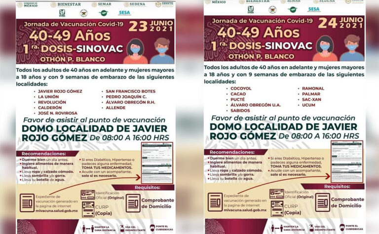 Anuncia gobierno vacunación covid para cuadragenarios en Othón P. Blanco, iniciará este miércoles 23 de junio y continuará un día mas el jueves 24