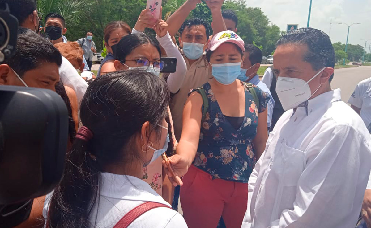 Al término de la inauguración de las oficinas de la Comisión Estatal de los Derechos Humanos en esta capital, el gobernador escucho a dos de las trabajadoras de ese programa quienes según dijeron son egresadas de la UQROO.