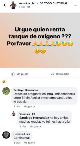 Chetumal.- Crece la tendencia en redes sociales solicitando equipo médico, ¿urge, quién renta tanque de oxígeno por favor? estos post se han vuelto desafortunadamente más frecuentes entre los usuarios de Facebook en Chetumal.