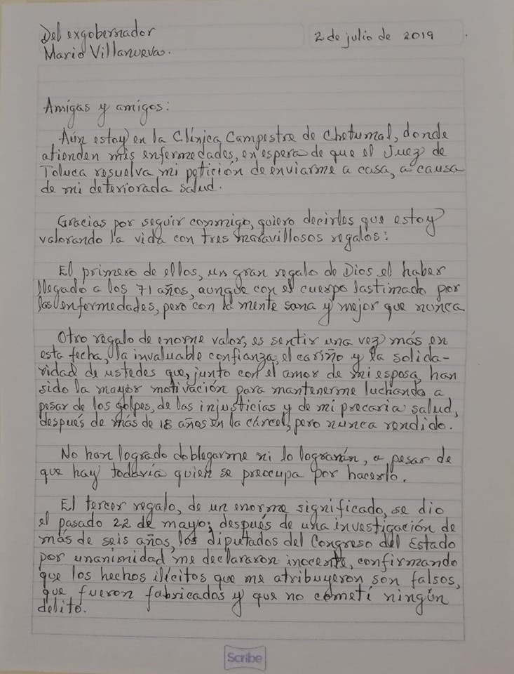 Confía Mario Villanueva Madrid en alcanzar su libertad; el ex gobernador de Quintana Roo festejó hoy su cumpleaños número 71 con un mensaje en redes sociales, con un oficio, escrito de su puño y letra, su estado de salud y situación legal.