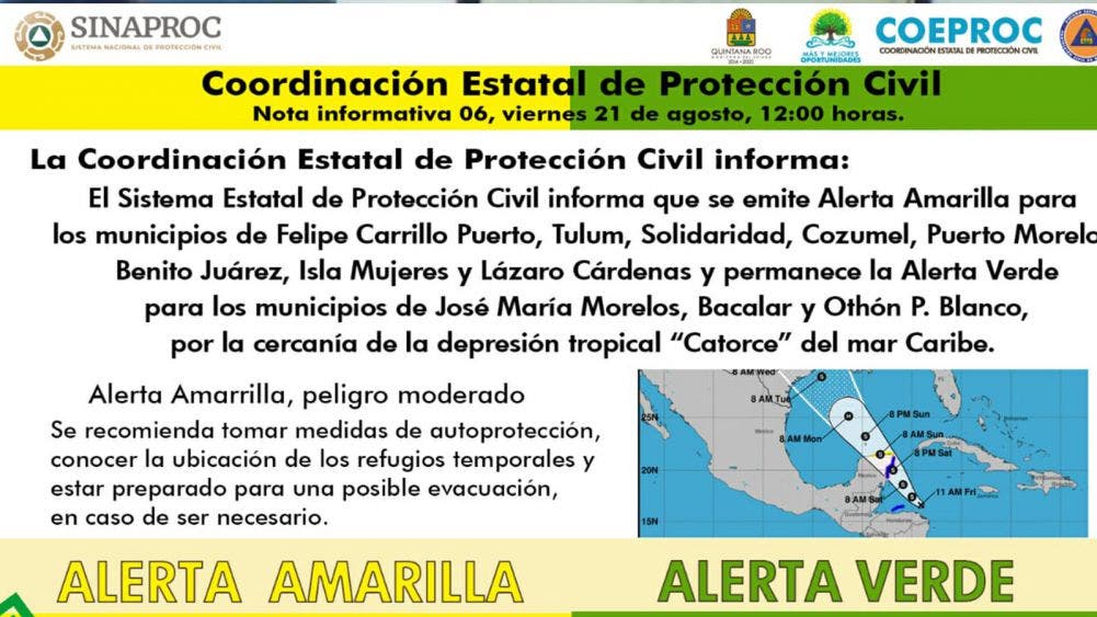 La tarde de este viernes, la Coordinación Estatal de Protección Civil (Coeproc), emitió la alerta amarilla para los municipios de Felipe Carrillo Puerto, Tulum, Solidaridad, Cozumel, puerto Morelos, Benito Juárez, Isla Mujeres y Lázaro Cárdenas.