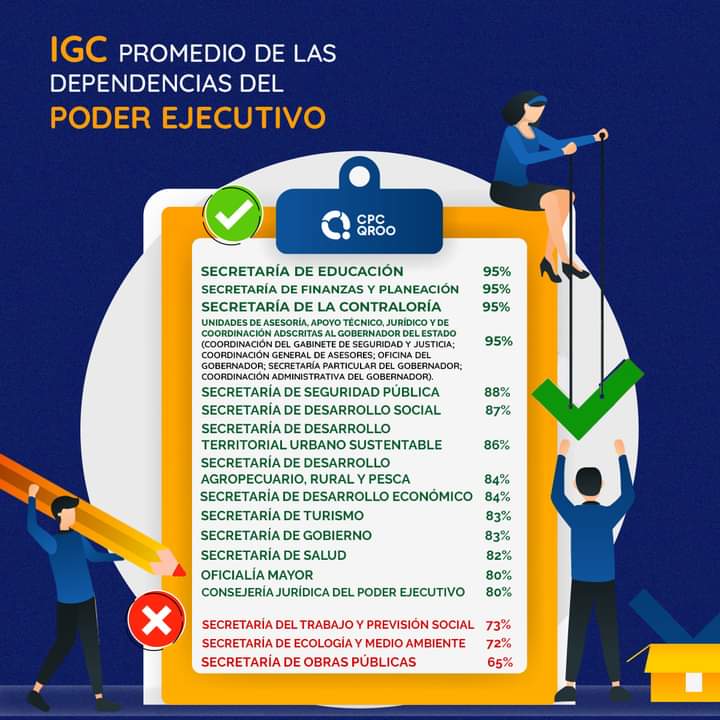 El Poder Legislativo el 92 por ciento y el , Judicial de 83 por ciento, mientras que Auditoria Superior del estado de Quintana Roo, se muestra un IGC promedio de 92%.