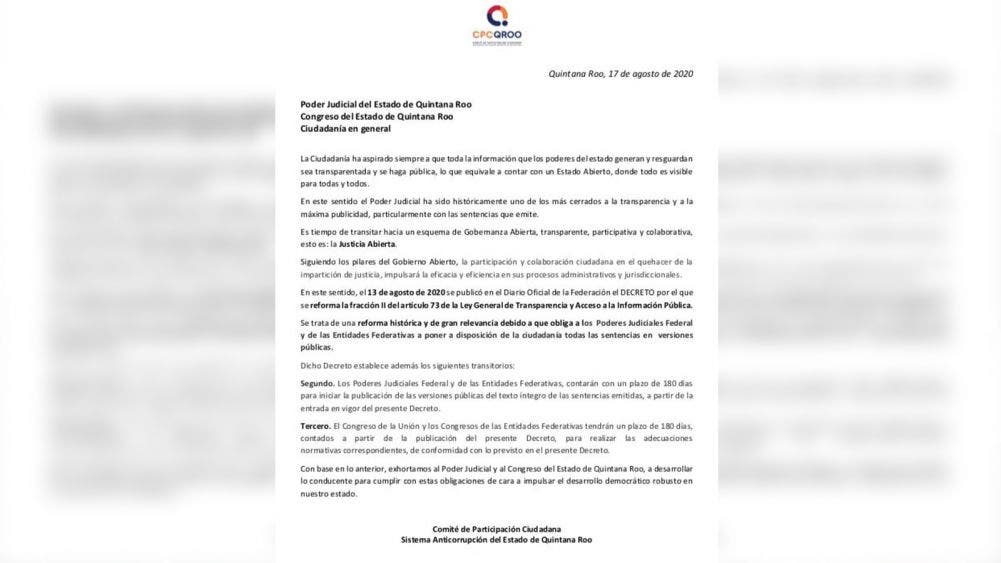 Exige comité ciudadano gobernanza abierta al congreso.- Exhorta el Comité de Participación Ciudadana del Sistema Anticorrupción al Congreso y el Poder Judicial para que transiten al esquema de Gobernanza Abierta, todas las sentencias que emitan deberán ser públicas para la ciudadanía.
