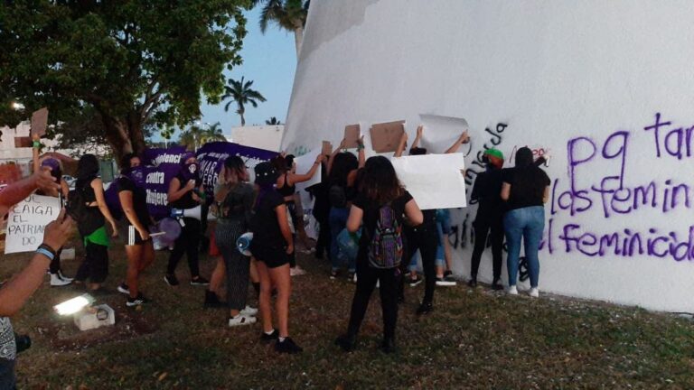 Feministas vandalizan de nuevo sede del Congreso de Quintana Roo.