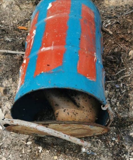 En el lugar se observó un tambo rojo con azul que contenía un cuerpo en descomposición.