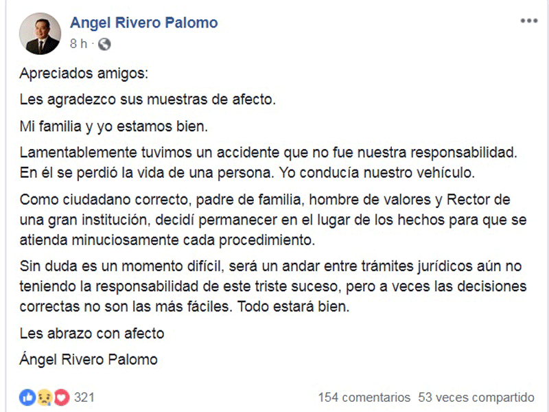 En su cuenta de Facebook, el rector de la Uqroo escribió: En lo personal, es mi responsabilidad cívica y también mi responsabilidad como funcionario público. A mis hijos les he explicado la situación. Es lo correcto, lo que hay que hacer. La familia de la persona fallecida tiene mi solidaridad hoy y la tendrá también más adelante.