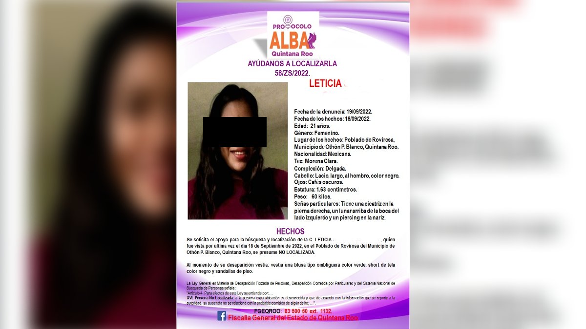 La Fiscalía General del Estado (FGE), dio a conocer que en fecha 19 de septiembre se inició una carpeta de investigación por la desaparición de una persona del sexo femenino, activándose la cédula de búsqueda Protocolo Alba Quintana Roo e iniciándose a la par los trabajos de gabinete y campo para su búsqueda en coordinación con otras autoridades.