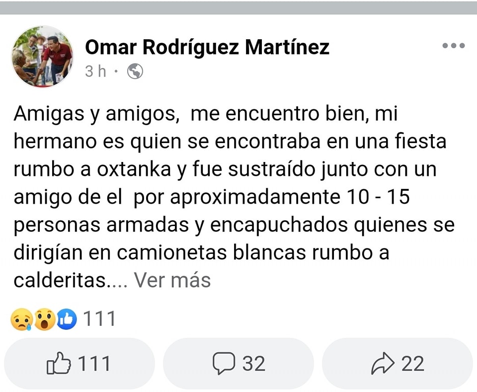 “Amigas y amigos, me encuentro bien, mi hermano es quien se encontraba en una fiesta rumbo a Oxtankah y fue sustraído junto con un amigo de él por aproximadamente 10-15 personas armadas y encapuchadas, quienes se dirigían en camionetas blancas rumbo a Calderitas. Desconocemos su paradero”, indicó en su mensaje en su cuenta de Facebook.