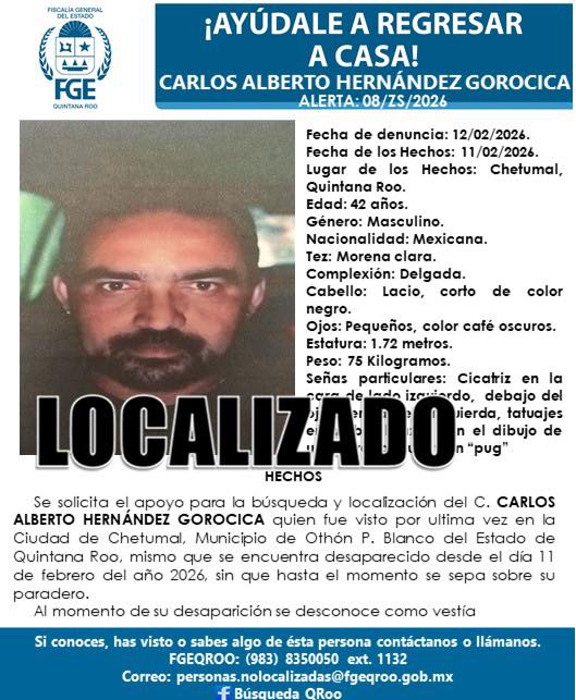 Información preliminar indica que se trataba de Carlos Alberto “N”, de 42 años, quien contaba con una alerta de búsqueda en Chetumal, quien presentaba huellas de haber sido sometido a torturas.