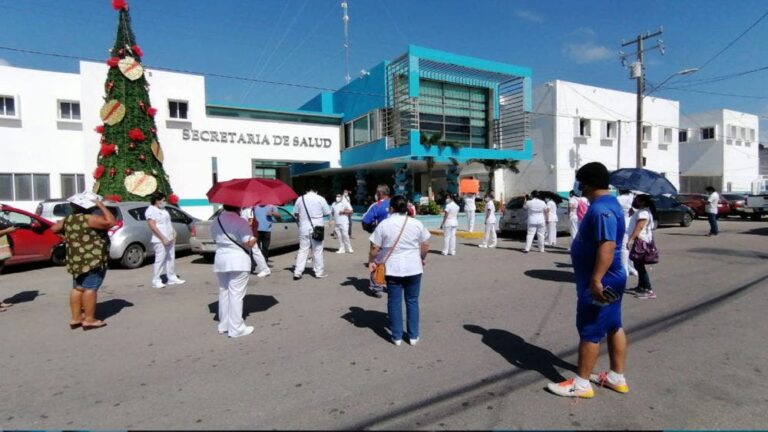 Personal de salud del Hospital General de Chetumal, realizaron este viernes una marcha y manifestación pacífica en la Secretaría Estatal de Salud (SESA) exigiendo el pago del bono Covid-19.