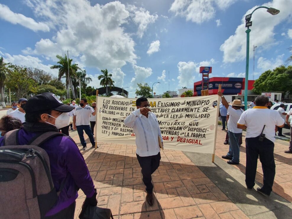 Alrededor de 150 taxistas del Sindicato Único de Choferes de Automóviles de Alquiler (Suchaa), se manifestaron esta mañana a las afueras del Palacio Municipal de Othón P. Blanco para exigir al presidente Otoniel Segovia, que explique los permisos otorgados para las concesiones de transporte público a mototaxis en comunidades de la ribera del río Hondo y comunidades del municipio de Bacalar.