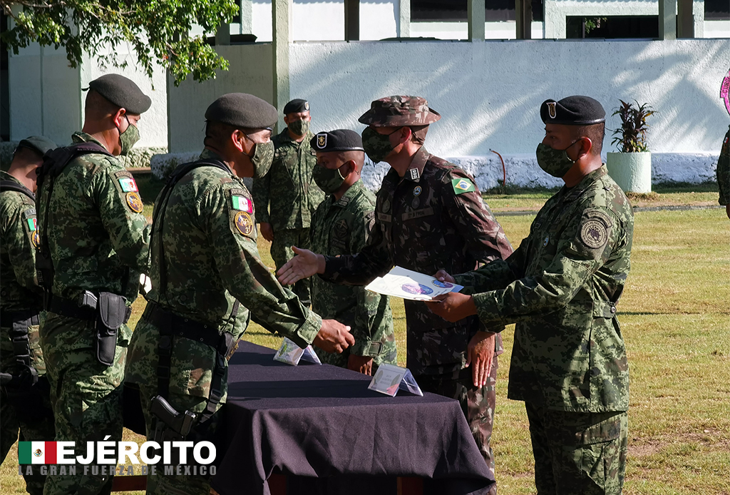 Un grupo de militares del Ejército Mexicano recibió esta tarde la documentación e insignias que acreditan su graduación del curso de Operaciones Ribereñas, en el Sub Centro de Operaciones en Selva y Anfibias del Centro de Adiestramiento de Fuerzas Especiales en Xtomoc, Quintana Roo.