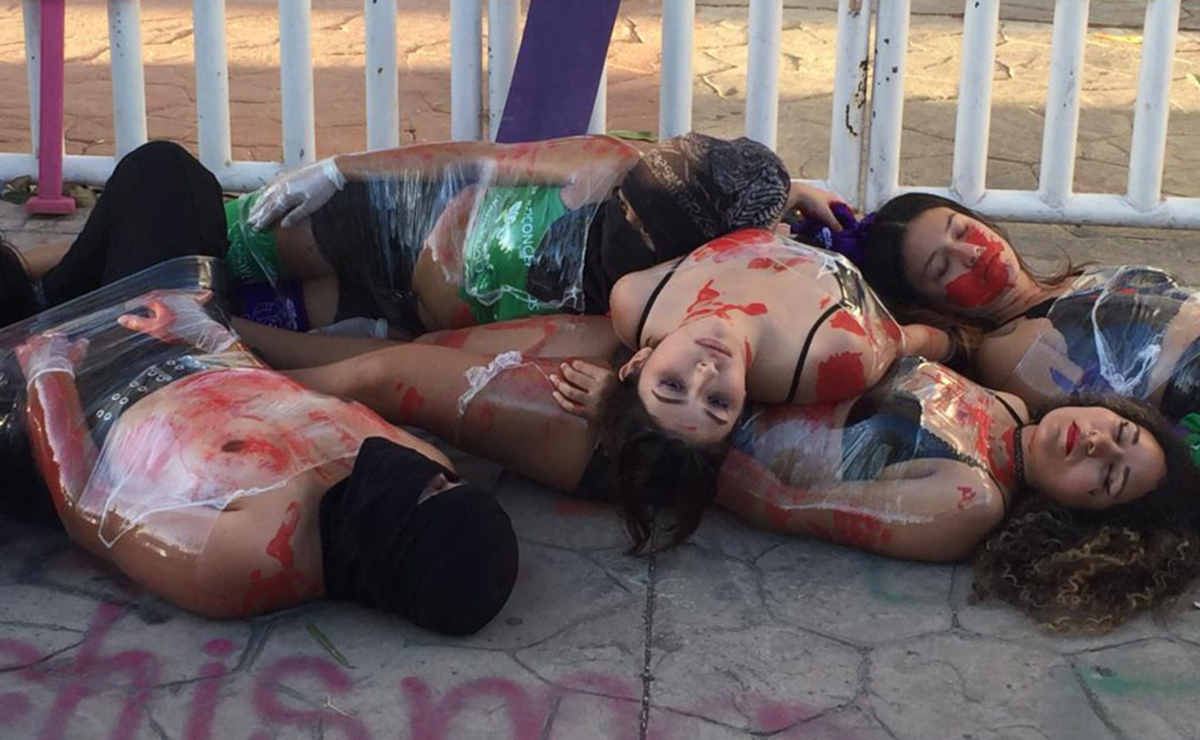 Las feministas vestidas de negro prendieron veladoras para rodear otro grupo que sólo portaban ropa interior pintadas de rojo en diferentes partes del cuerpo para representar la sangre derramada, se recostaron como si estuvieran fallecidas en las puertas de la FGE.