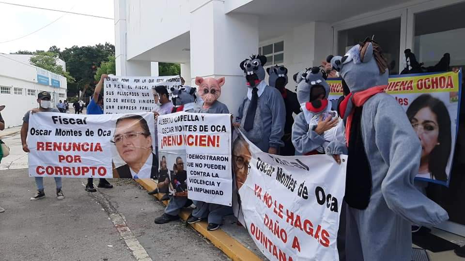 Disfrazados de ratas, integrantes de la organización “Somos tus Ojos” por la Transparencia Quintana Roo, realizaron una primera marcha en contra de la impunidad y la corrupción en la Fiscalía General del Estado (FGE).