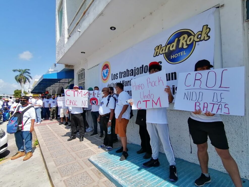 Un promedio de 100 trabajadores sindicalizados de la cadena de hoteles Hard Rock en Quintana Roo, se manifestaron este miércoles, en las instalaciones de la Junta Local de Conciliación y Arbitraje en Chetumal.
