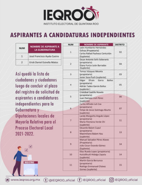 Un total de 13 aspirantes a candidaturas independientes para las elecciones del 2022 en Quintana Roo, lograron registrarse antes de que venciera el plazo fijado por el Instituto Electoral de Quintana Roo (Ieqroo).