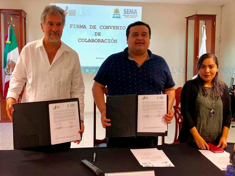 Chetumal.-La Secretaría Estatal del Medio Ambiente (Sema) suscribió un convenio de colaboración con la Comisión de los Derechos Humanos del Estado (CDHE) en el que se compromete a contribuir con acciones que permitan fomentar programas relacionados con la investigación académica, capacitación, formación, difusión y promoción en materia de derechos humanos.