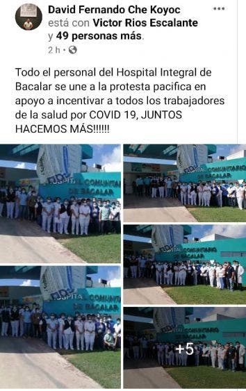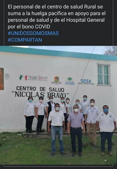 Por otro lado, debido a la manifestación del personal de salud del hospital general, otras unidades médicas como el hospital comunitario de Bacalar, el centro de salud de la comunidad de Nicolás Bravo, el centro de salud de la comunidad de Calderitas, el centro de salud Urbano de la colonia Caribe entre otros se sumaron al paro de labores en apoyo al personal médico del hospital general de Chetumal a fin de lograr el pago de “bono Covid” para los trabajadores de la capital del Estado.