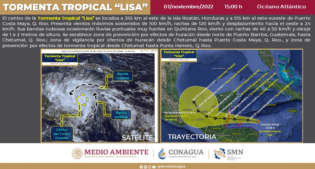 Con la misma peligrosa dirección pronosticada por el Servicio Meteorológico Nacional (SMN) de manera inicial, la tormenta tropical «Lisa» avanza con dirección oeste y se ubica ya a 515 kilómetros de Quintana Roo.