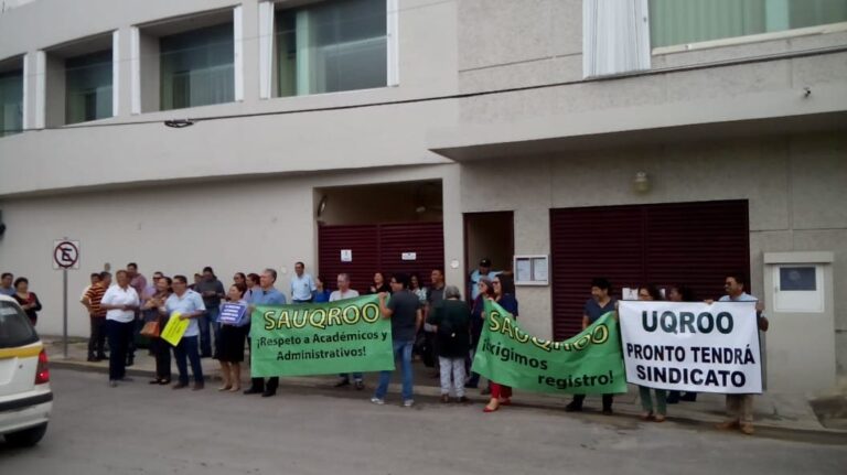En busca de la conformación del Sindicato de Trabajadores de la Universidad de Quintana Roo (Sauqroo) se manifestaron frente al Juzgado de Distrito con sede en Chetumal. Trabajadores de la Uqroo buscan conformar sindicato.