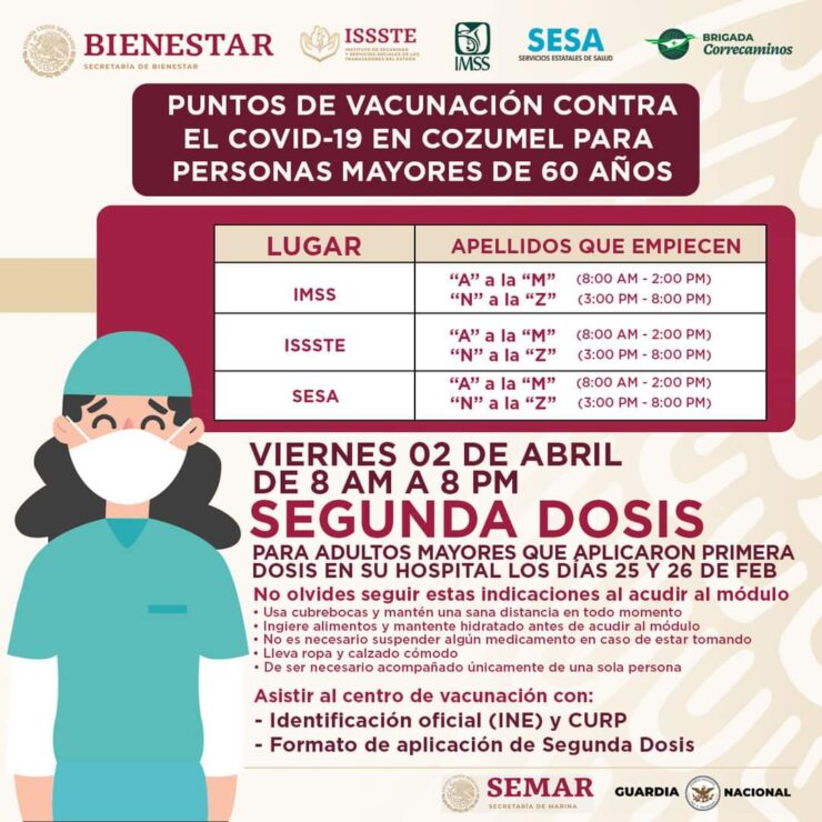 También hizo hincapié que tendrán que ir al nosocomio donde les pusieron la primera vacuna, con su INE, copia de la Curp y su tarejeta donde está la primera dosis.