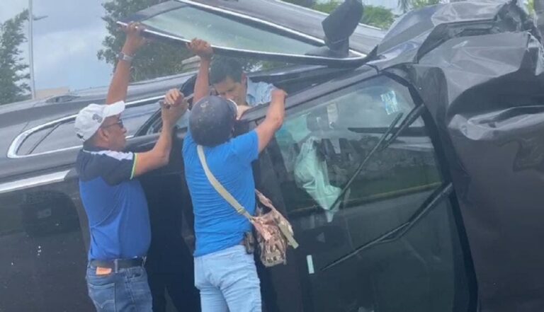 De su vehículo volcado tuvo que ser rescatado Aurelio Joaquín, después que chocará su automóvil de lujo en el monumento al escuadrón 201 derribandolo por completo al igual que un poste de luminaria justo en la entrada de la zona hotelera norte de la isla.