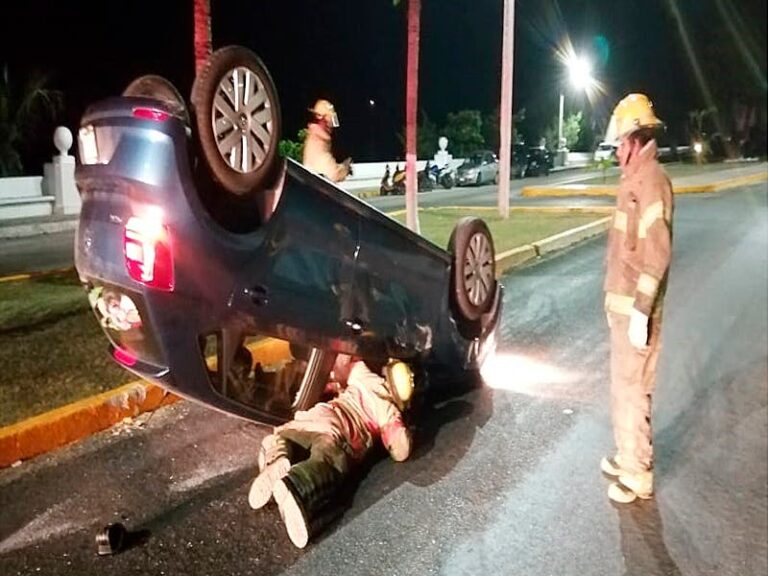 Un automóvil quedó totalmente volcado en la carretera norte de la Isla de Cozumel, luego de que su conductora transitara a exceso de velocidad y colisionara contra un vehículo estacionado.