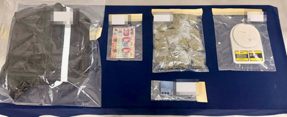 Tras la inspección, se aseguraron 42 bolsitas tipo ziploc con vegetal similar a la marihuana, además de una báscula gramera, un teléfono celular, dinero en efectivo y una motocicleta sin placas.