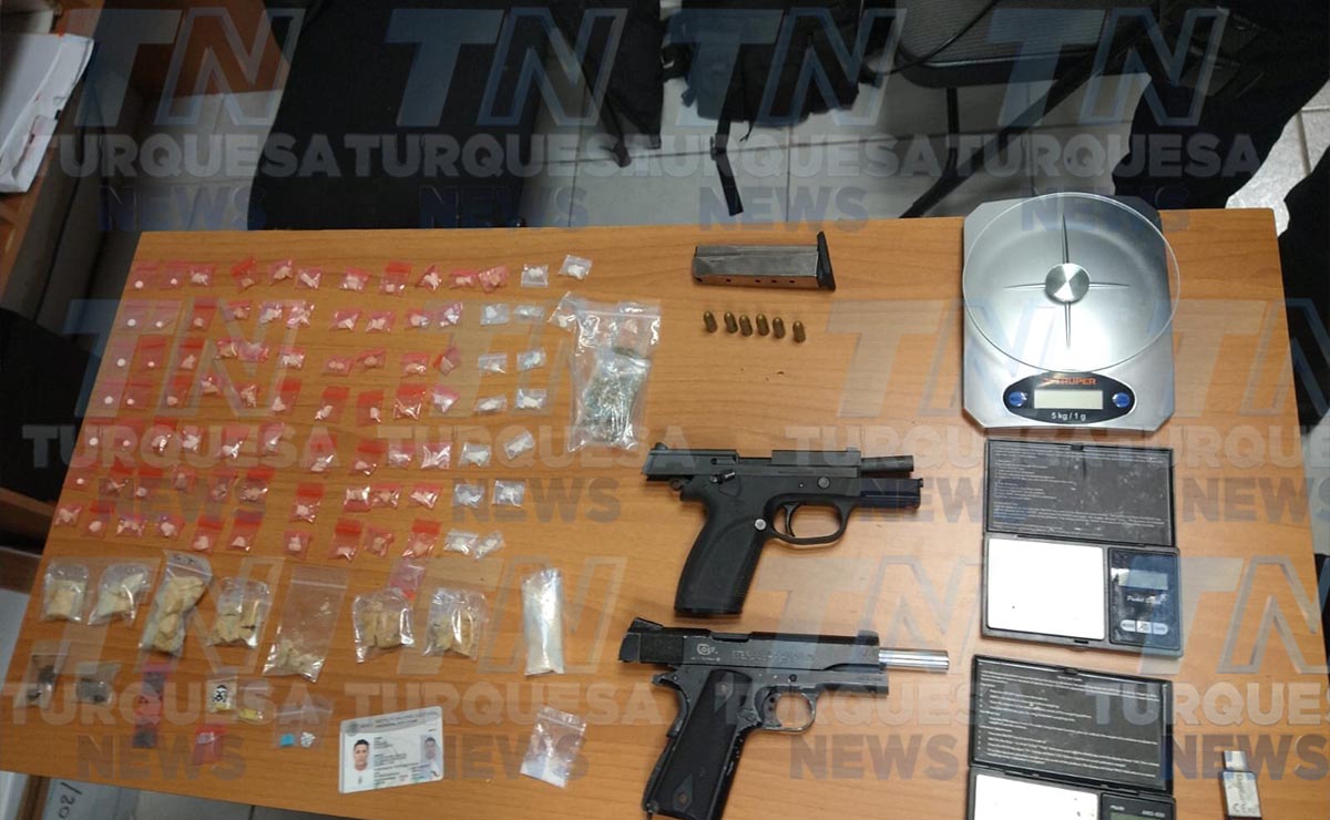 Mientras que Oscar Israel S.N. de 19 años de edad, tenía en su poder una pistola sin cargador, además de 16 bolsitas (dosis) de crack y 11 bolsitas con pastillas, mientras que en la bolsa gris que soltaron al momento de su detención había tres básculas grameras y más de 40 dosis de marihuana, varias dosis crack, pastillas, y cigarros de marihuana.