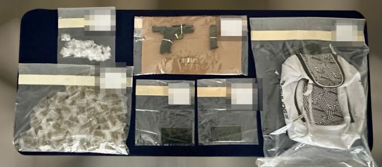 Tras una revisión preventiva, los agentes aseguraron un arma corta calibre 9 milímetros con cargador abastecido, así como diversas bolsas con sustancias que presentan características de narcóticos.
